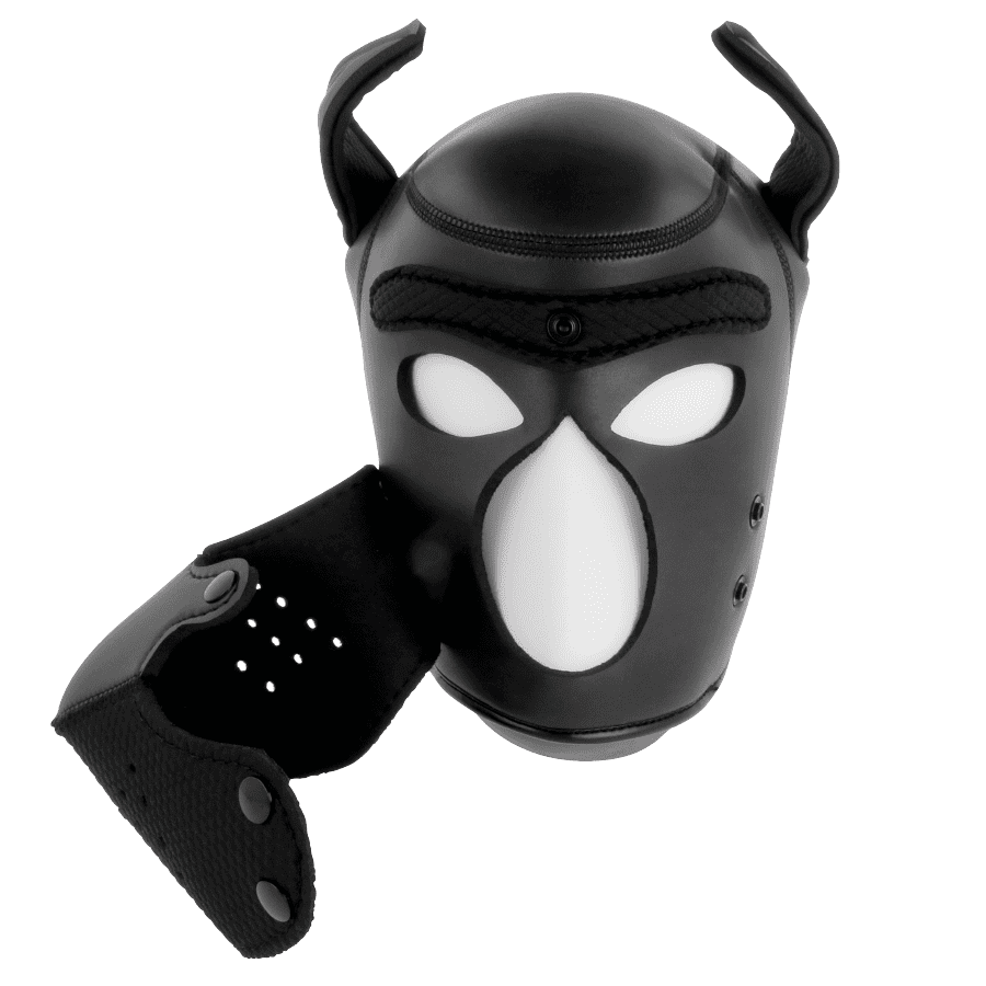 Diese Hundemaske besteht aus Neopren und ist daher leicht, atmungsaktiv und angenehm zu tragen. Die Maske ist so konzipiert, dass sie hinten einrastet und Ohren und Schnauze fixiert.
