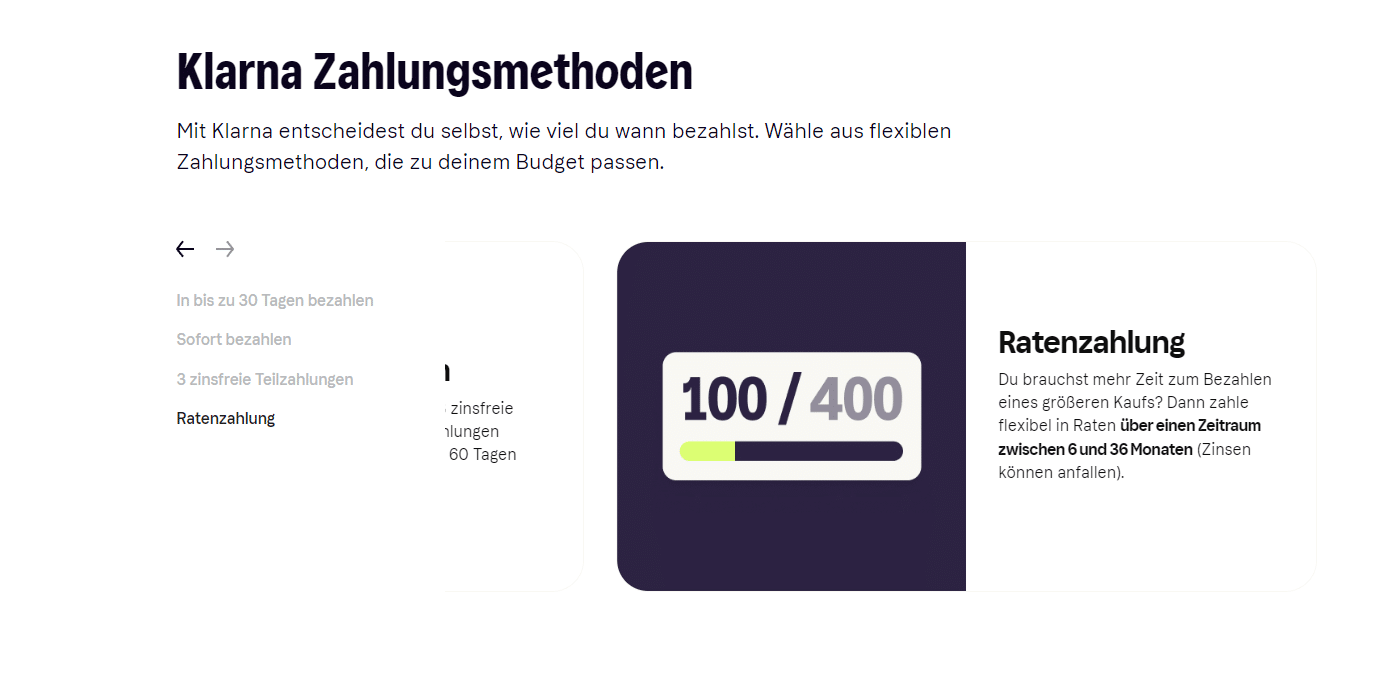 Flexible Ratenzahlungen: Mit Klarna kannst Du Deinen Einkauf in bequemen monatlichen Raten bezahlen. Diese Option bietet dir finanzielle Flexibilität, da Du den Betrag über einen festgelegten Zeitraum in kleineren Beträgen abbezahlen kannst.